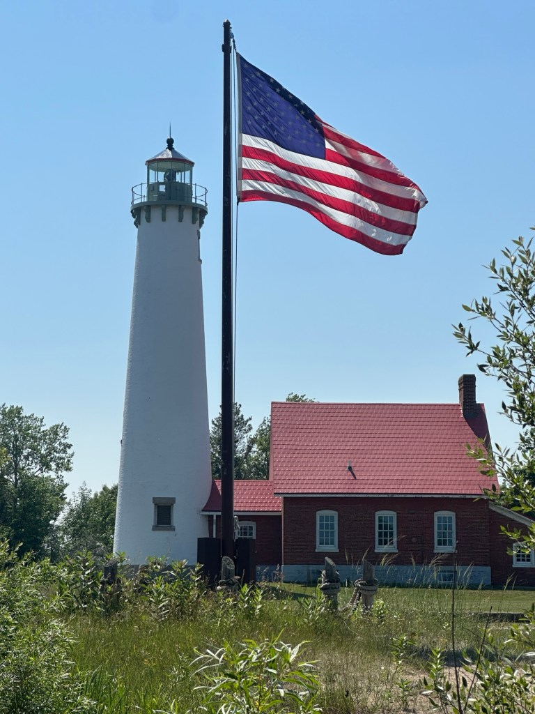 We needed to do something other than just ride in the RV and see edges of the lake while driving through small towns, so we pulled into East Tawas, MI, to see their lighthouse.  It was a great stop for an hour or so.  We were able to tour the lightkeeper’s home and then climb the lighthouse, which had only been decommissioned in 2016.  I found a Raggedy Ann doll sitting on a bed that was just like one I had as a child.  That brought back good memories.  Dominic said that the doll gave him the creeps.