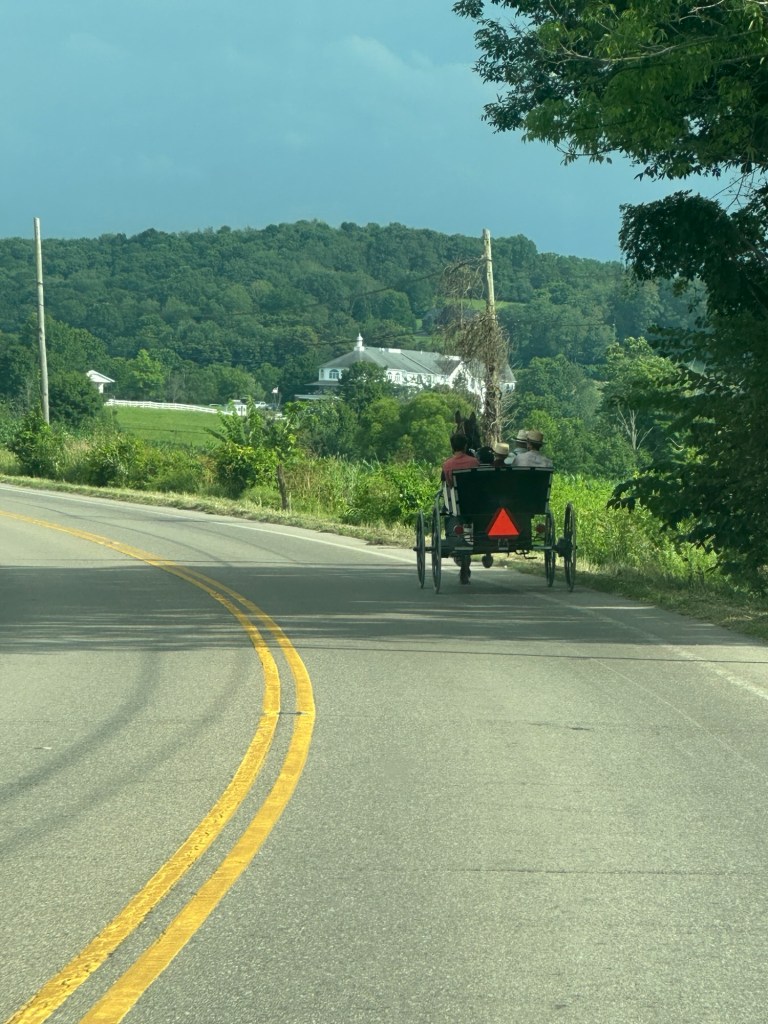 A typical sight in Amish country. Charlie is amazed at how well-trained the horses are to not be scared of passing cars and trucks.