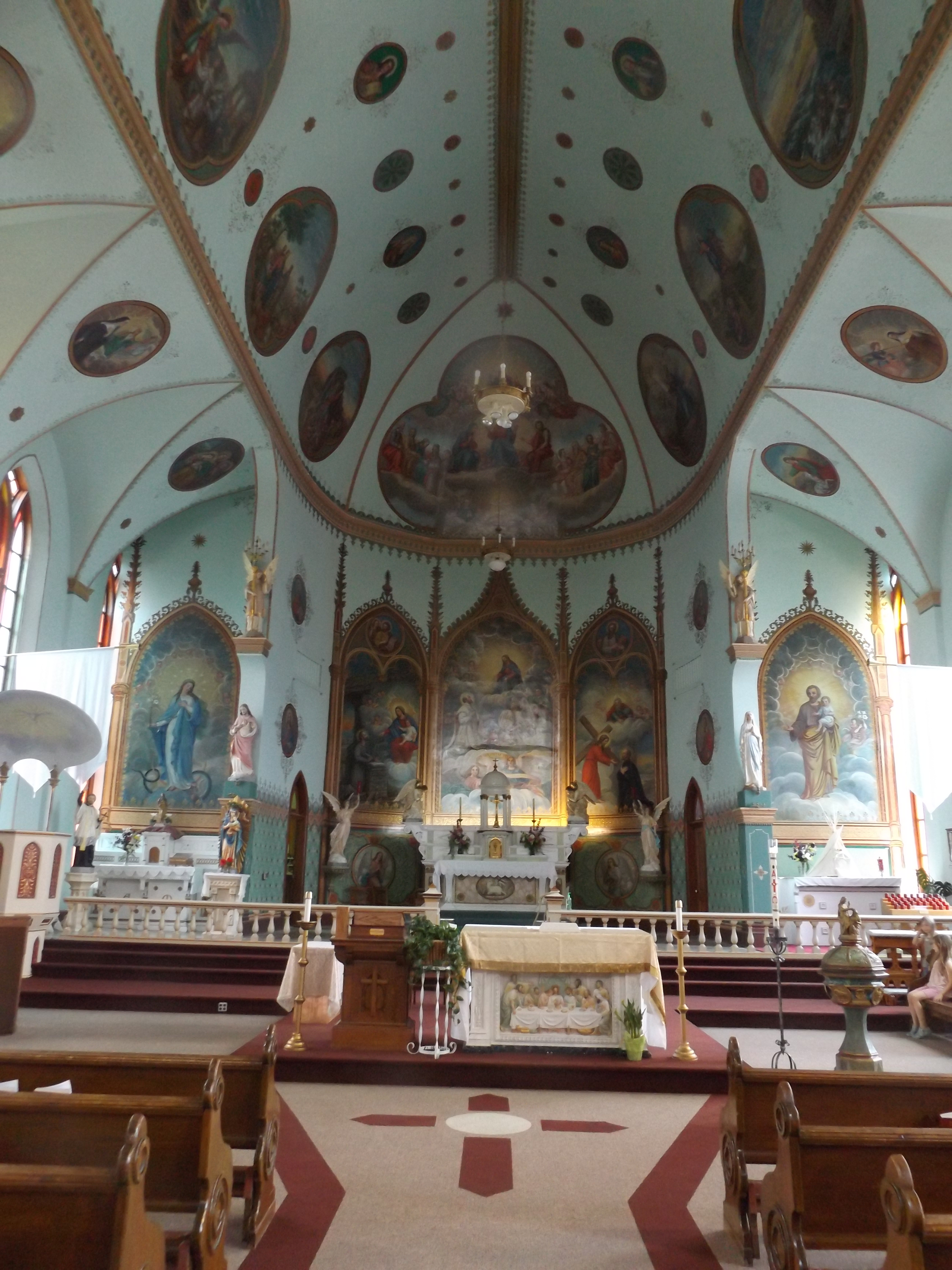 There was a sign indicating the history of the church, and that Mass was still being said there on a weekly basis. We saw a gentleman doing some odd jobs around there, and he told us that we were welcome to go in. As soon as I stepped into the church, my eyes filled with tears. It was so beautiful! It was just as beautiful as any of the cathedrals I have ever been in, and I would go so far as to say that I felt that it was just as beautiful as the Shrine of the Immaculate Conception in Washington, DC. The kids old enough to appreciate such beauty were instantly awed. What a magnificent church built and decorated to give glory to our Lord!