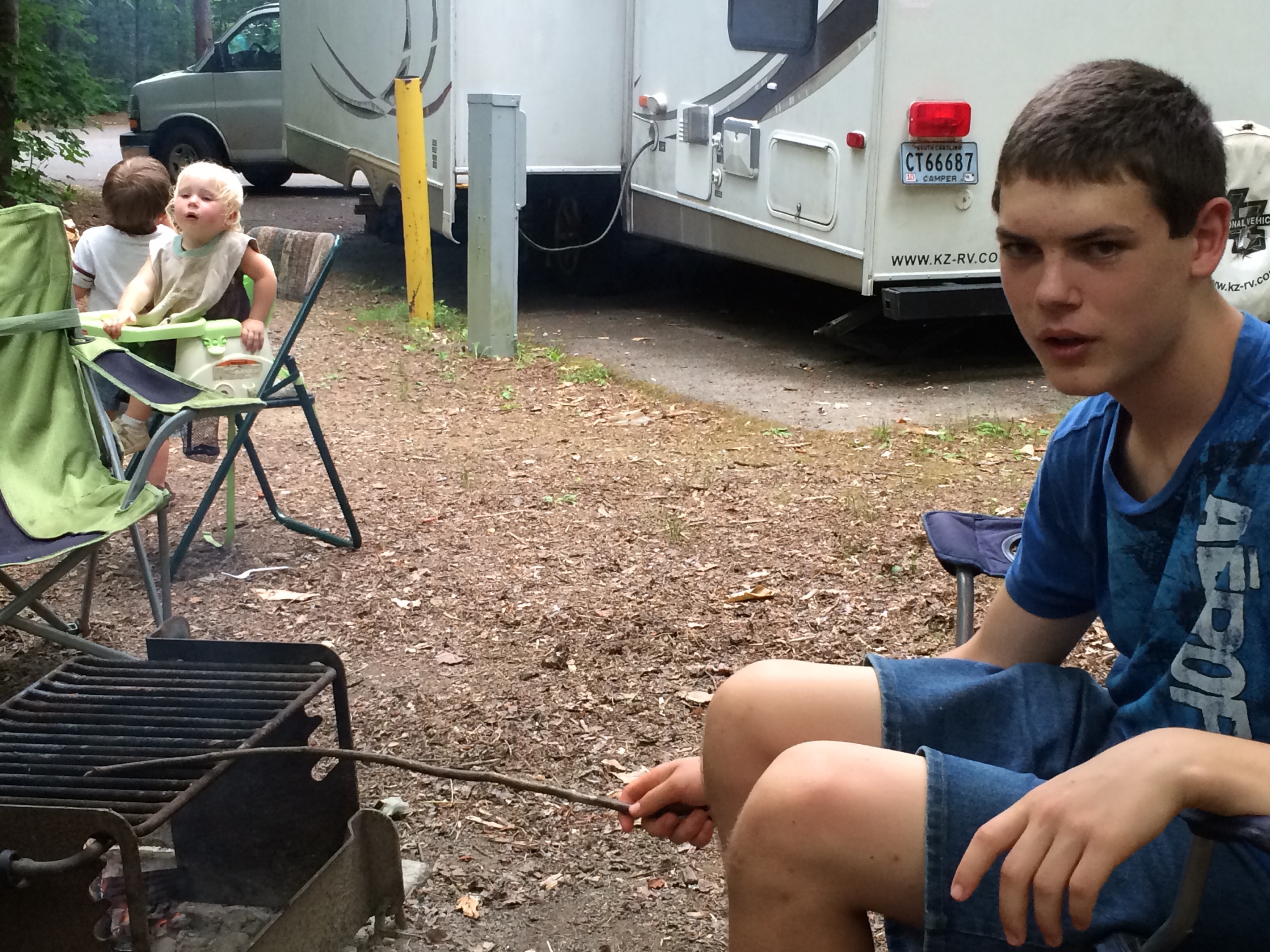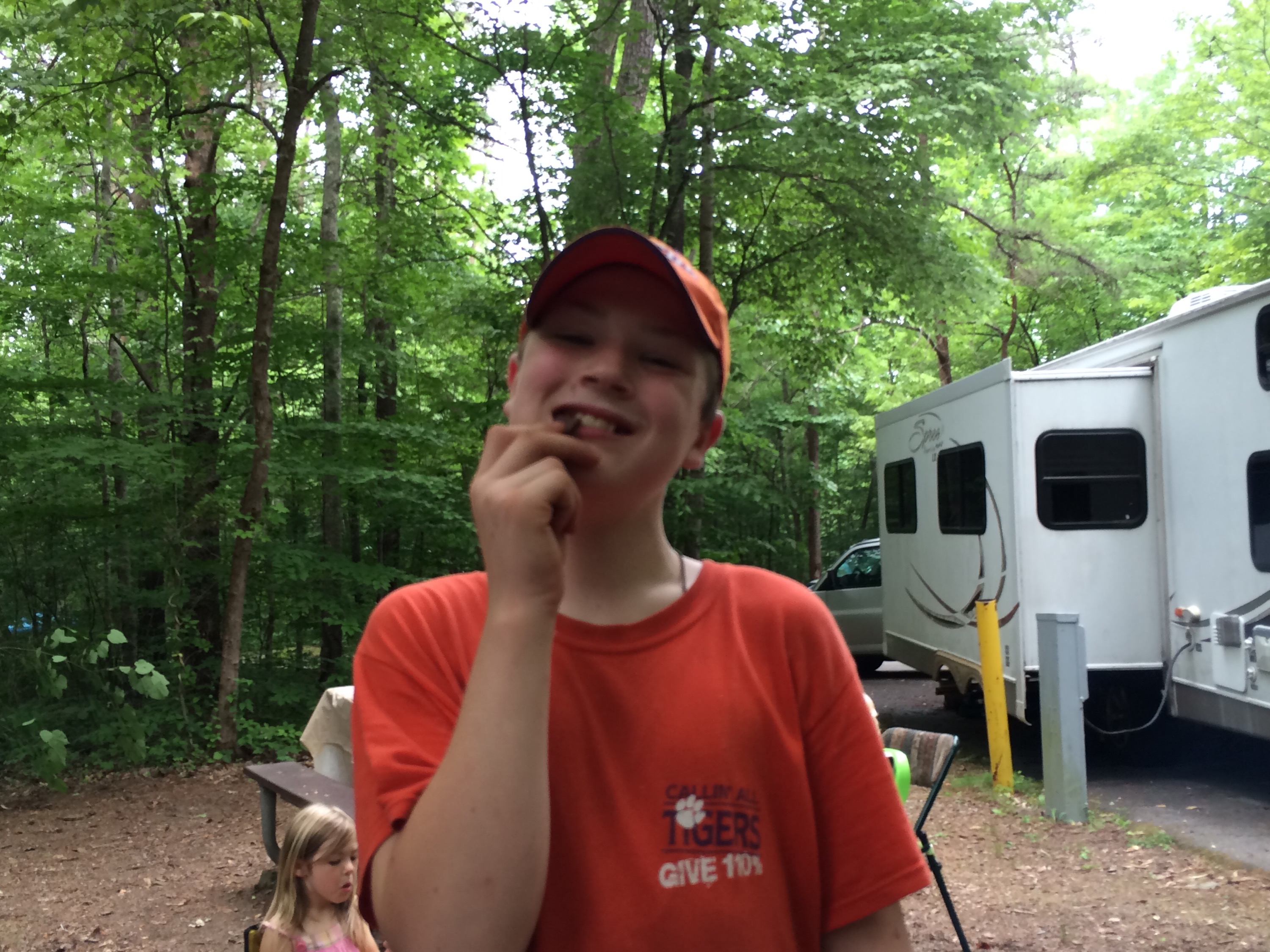 After our hike, we returned to the campground for lunch. The kids were all moaning about “peanut butter and jelly again?” but when you don’t eat meat on Fridays and you are having quick lunches, PB&J is an easy, go-to meal. We all climbed back into the van for a little driving. In the hopes that some littles would sleep in the van, we ran a couple errands: a quick oil change and picking up charcoal for grilling dinner. Next we took the pinnacle drive up a steep, narrow road to an overlook where you could see the surrounding areas as well as the point where the three states of Kentucky, Tennessee, and Virginia meet. The kids all thought it was neat to drive into three different states in a matter of about two minutes. We finally went back to the Visitors’ Center to see the film about Daniel Boone. They had a nice dress-up area for the littles, which kept them occupied for probably thirty minutes. I sure would like to have some dress-ups like that at home – nice quality wool coats, linen shirts, wool trousers, and wool tricorn hats for the boys. The girls had some really cute hats and cotton dresses along with wool capes. There was also a craft center and a gentleman demonstrating his craft of broom making. I bought a beautiful piece of pottery as a little remembrance of this trip.      We headed back to the campground for our dinner of grilled salmon with mango salsa and broccoli. We were going to finish our last night on this trip eating well. The kids even had s’mores for dessert. We all had a little down time in the campground, just enjoying the outdoors. It is hard to believe this is our last night of our trip of blessings – I guess all good things must come to an end. We will be home tomorrow.