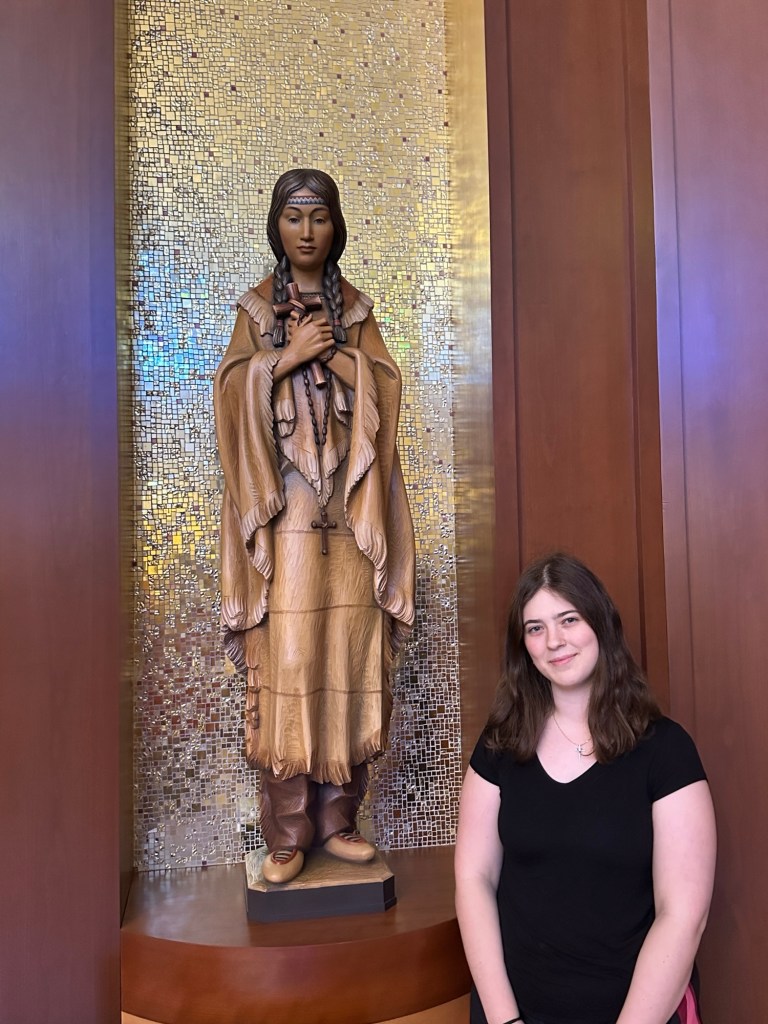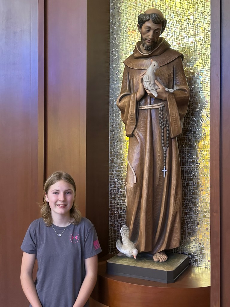 The statues in the chapel were beautiful. Annette and AnaClaire both had their pictures taken with their chosen Confirmation saints: St. Kateri and St. Francis of Assisi respectively.