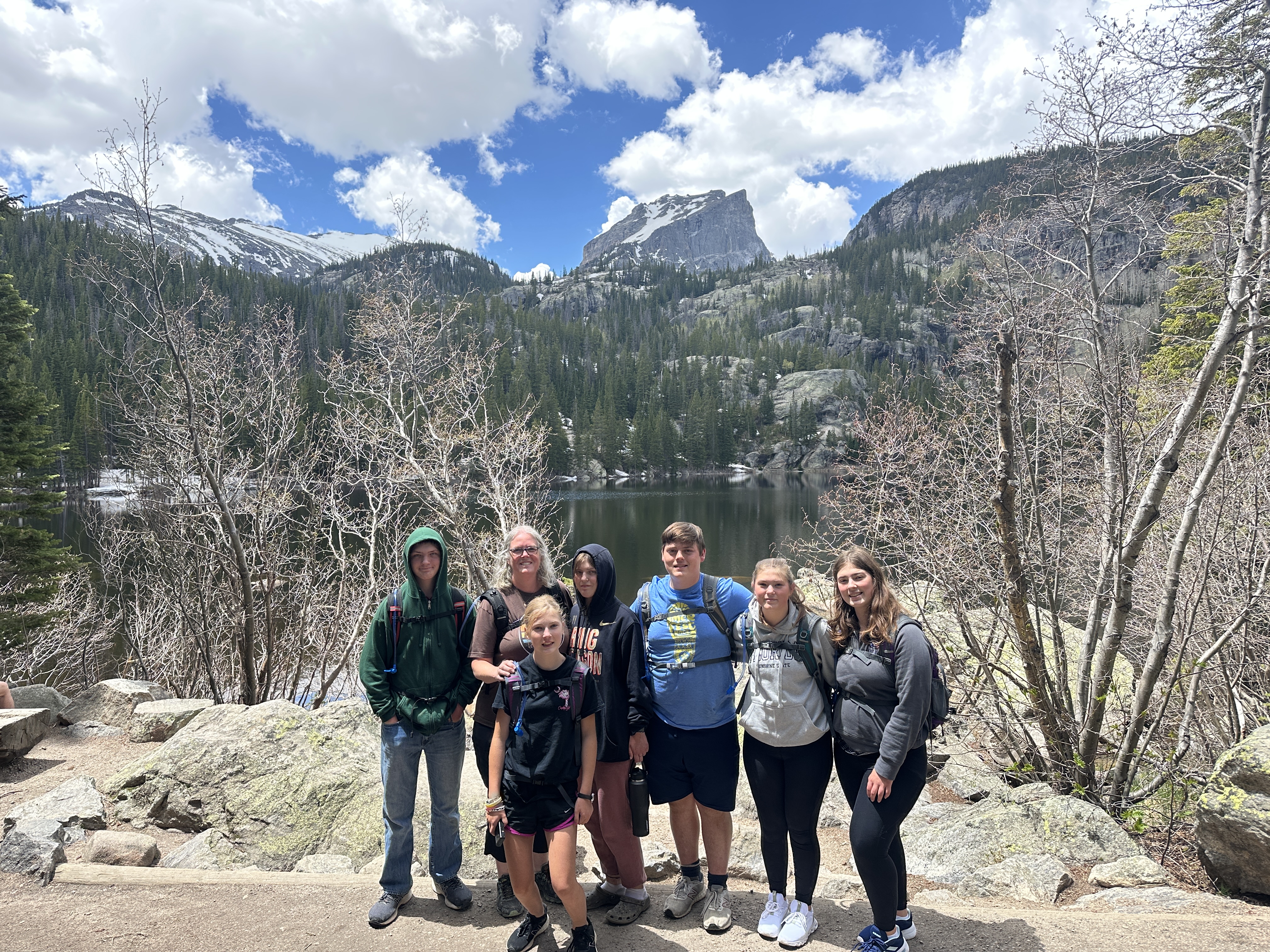 Saturday, we went into the park. My cold had not improved, and this was probably the worst I had felt. Charlie, AnaClaire, Isaac, Dominic, and Alex all caught my cold, unfortunately. We decided to see what we could do anyway. We spent most of the day driving Trail Ridge Road, which took us through Alpine, Subalpine, and Morane levels of ecosystems. It was all mesmerizing. We also took the drive into Bear Lake where we decided to stop and do a little hiking. Fortunately for us, they had a great, easy hike around the lake. It allowed us to get out and move, hike through some snowy spots, enjoy the beauty of the lake surrounded by the mountains, and breathe in some good fresh mountain air. I had not at all felt up to hiking but was really glad we decided to do that trail.
